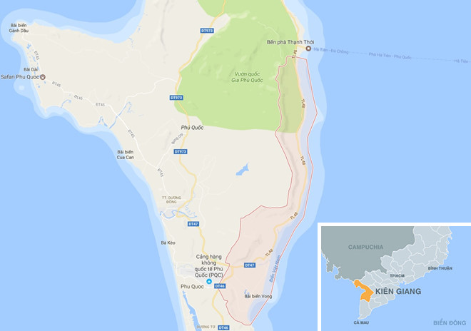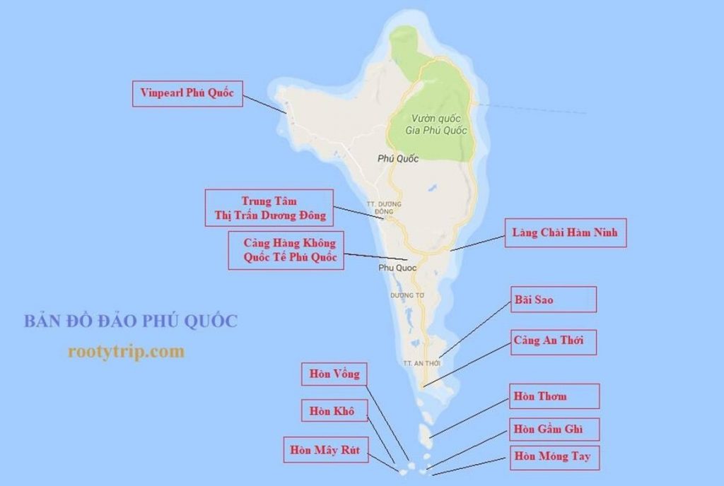 Đây cũng là một trong những hòn đảo lớn nhất Việt Nam với hơn 22 quần thể đảo lân cận xung quanh nằm trong Vịnh Thái Lan , nhìn bản đồ du lịch Phú Quốc nói chung và bản đồ Việt Nam nói chung có thể thấy đây là hòn đảo trực thuộc tỉnh Kiên Giang với tổng diện tích 589,23km , thuộc thị trấn Dương Đông tọa lạc phía Tây vĩ tuyến