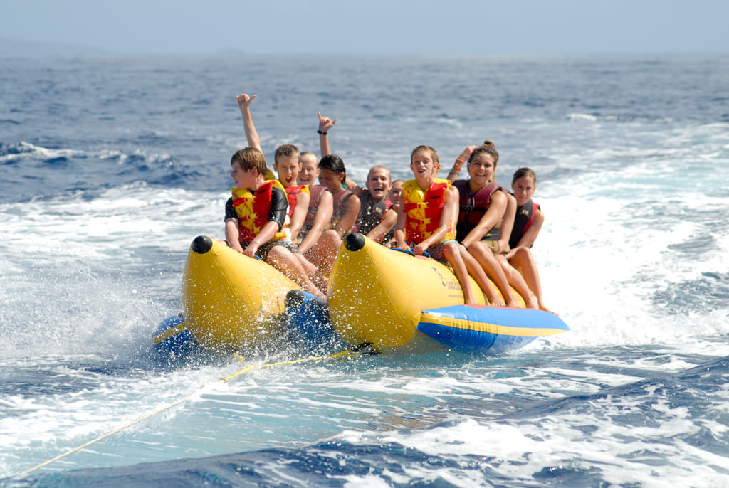 Đây là trò chơi thể thao cảm giác mạnh, nhưng cần sự gắn kết của tập thể, mang lại nhiều tiếng cười, niềm vui cho mỗi người tham gia. Mỗi du khách sẽ được mặc một chiếc áo phao, mỗi nhóm khoảng 5 – 7 người ngồi trên một chiếc thuyền phao chuối có tay cầm để bám vào và được kéo bằng cano có tốc độ từ 50 – 80km/h. Trò chơi này rất phù hợp với những hoạt động teambuilding của các công ty, doanh nghiệp.