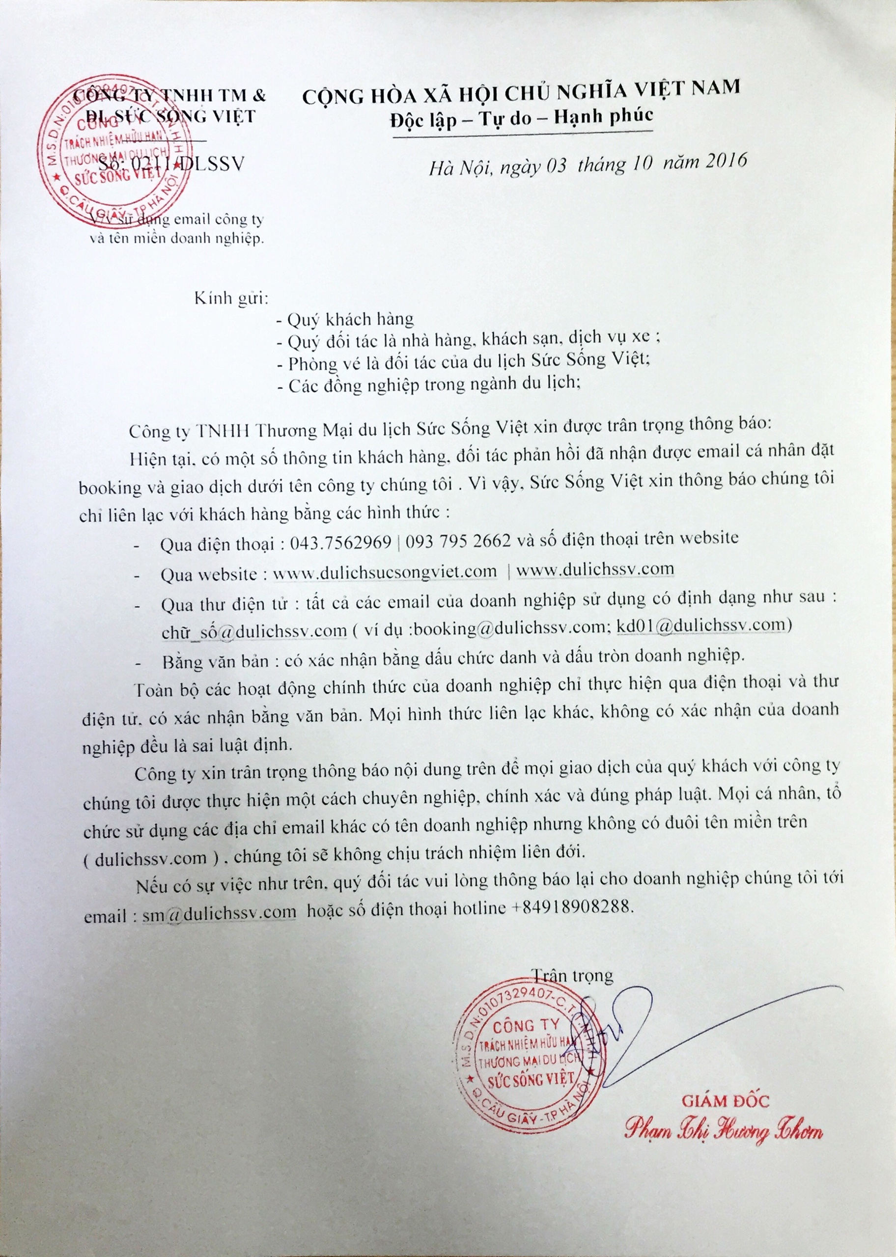 Thông báo email công tác du lịch Sức Sống Việt